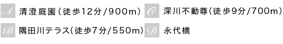 | 江東永代郵便局 | 徒歩5分(約400m) |